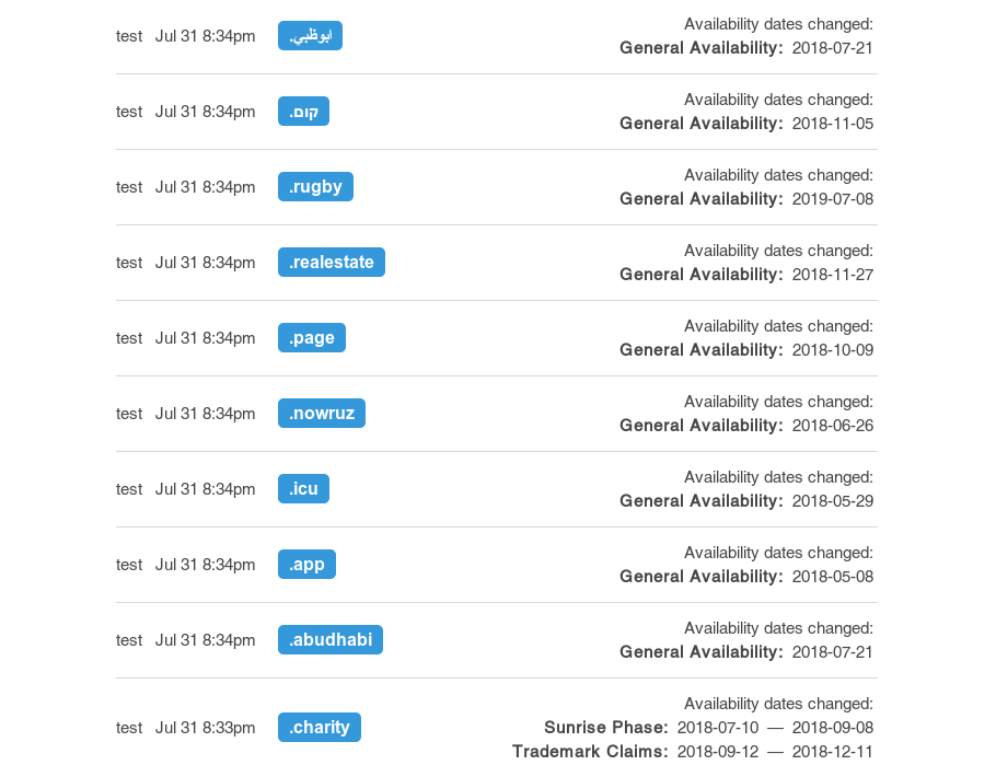 - ketika tanggal ketersediaan TLD diketahui atau berubah (tanggal Ketersediaan Umum/Fase Sunrise/Fase Merek Dagang).